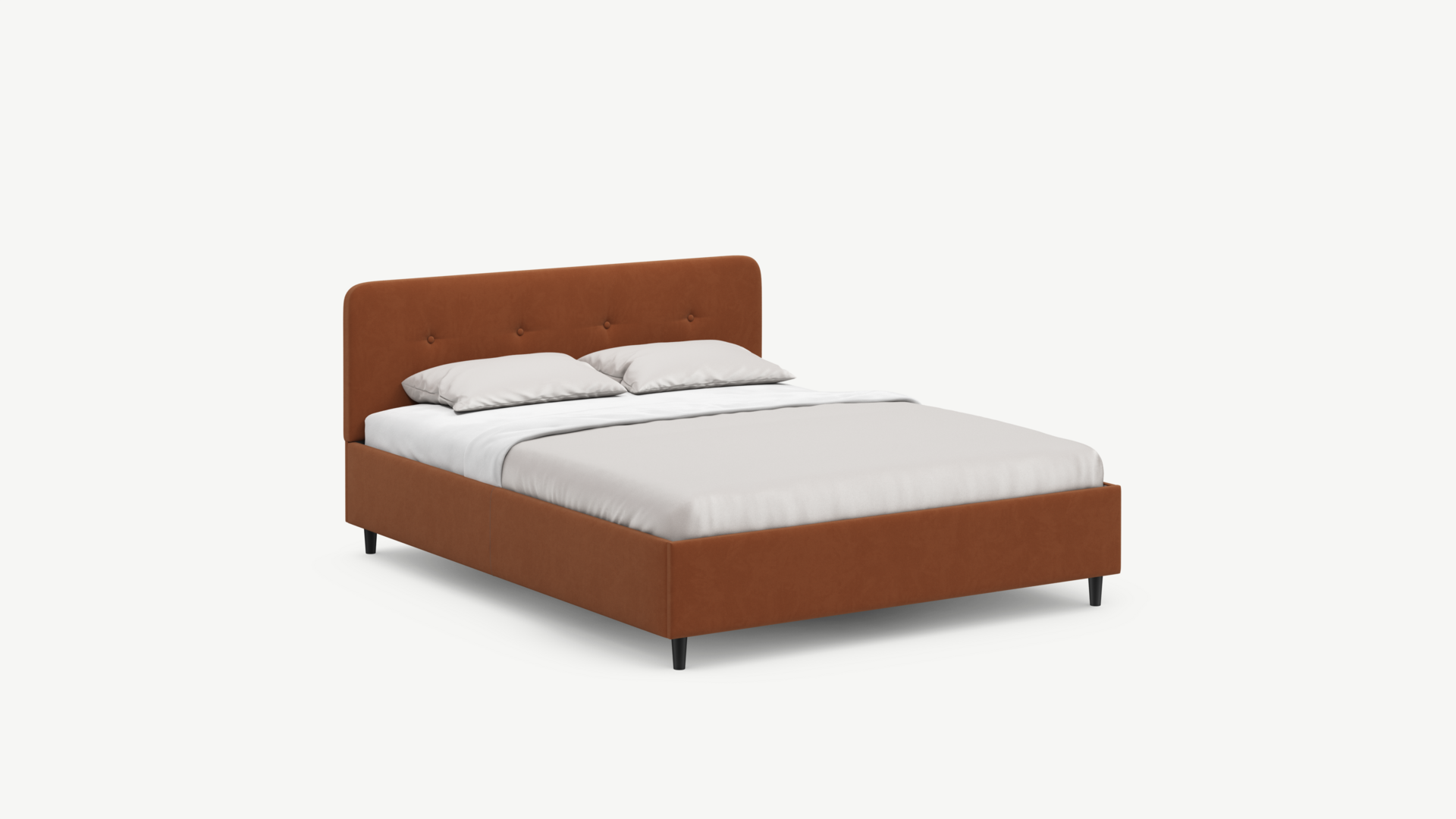 Царга, задающая пропорции, благодаря гладкости своей фактуры подчеркивает центральный элемент декора. Высокие опоры приподнимают фигуру кровати над полом и добавляют её образу визуальной легкости.
