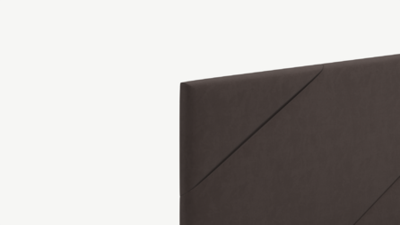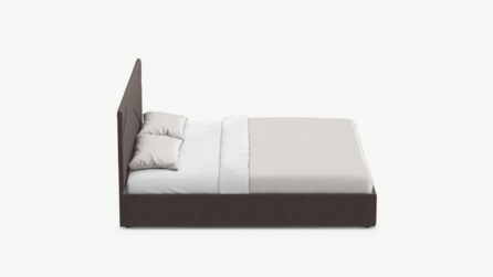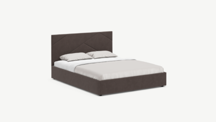 MOON FAMILY 1257 привлекает внимание оригинальным исполнением: широкие полосы ткани эффектно пересекают периметр изголовья, создавая на нем графический орнамент. Элегантным и практичным акцентом служат скрытые карманы, расположенные по его углам. Лаконичные формы объемных царг создают единый гармоничный образ и фокусируют внимание на центральном текстурном элементе кровати.