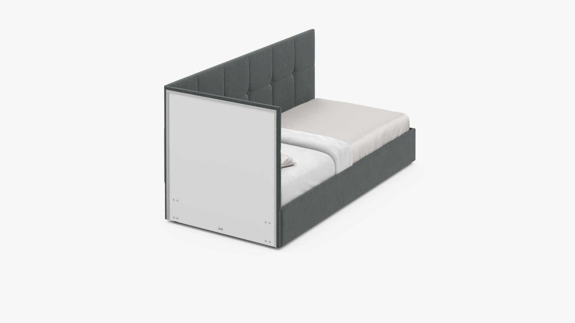 Угловая односпальная кровать MOON FAMILY 1261 с мягкой спинкой и изголовьем создаст в Вашей спальне ощущение уюта. Крупная квадратная стежка привносит в интерьер графических акцентов, а вставка из пуговиц наполняет пространство ощущением домашнего тепла.
